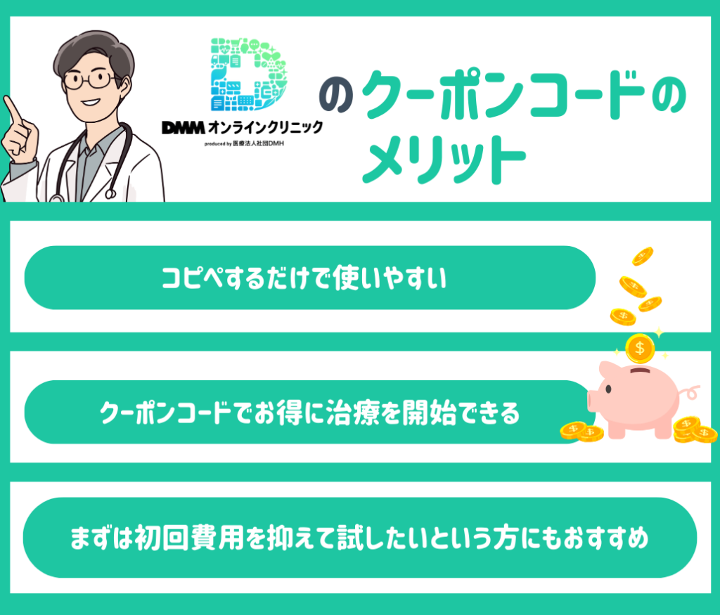 DMMオンラインクリニックでの受診を考える人の中には、クーポンコードを使って安く治療を始めたい人も多いのではないでしょうか?