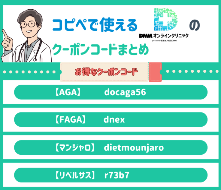 - DMMオンラインクリニックのFAGAのクーポンコードは何ですか?