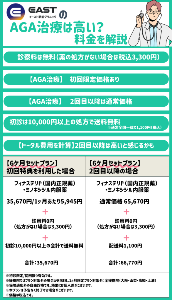 イースト駅前クリニックのAGA治療薬は2回目以降、通常価格となります。