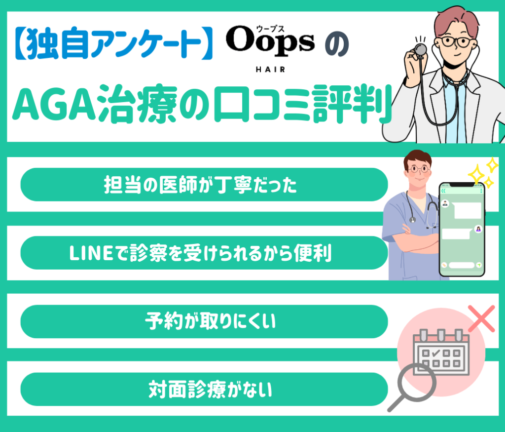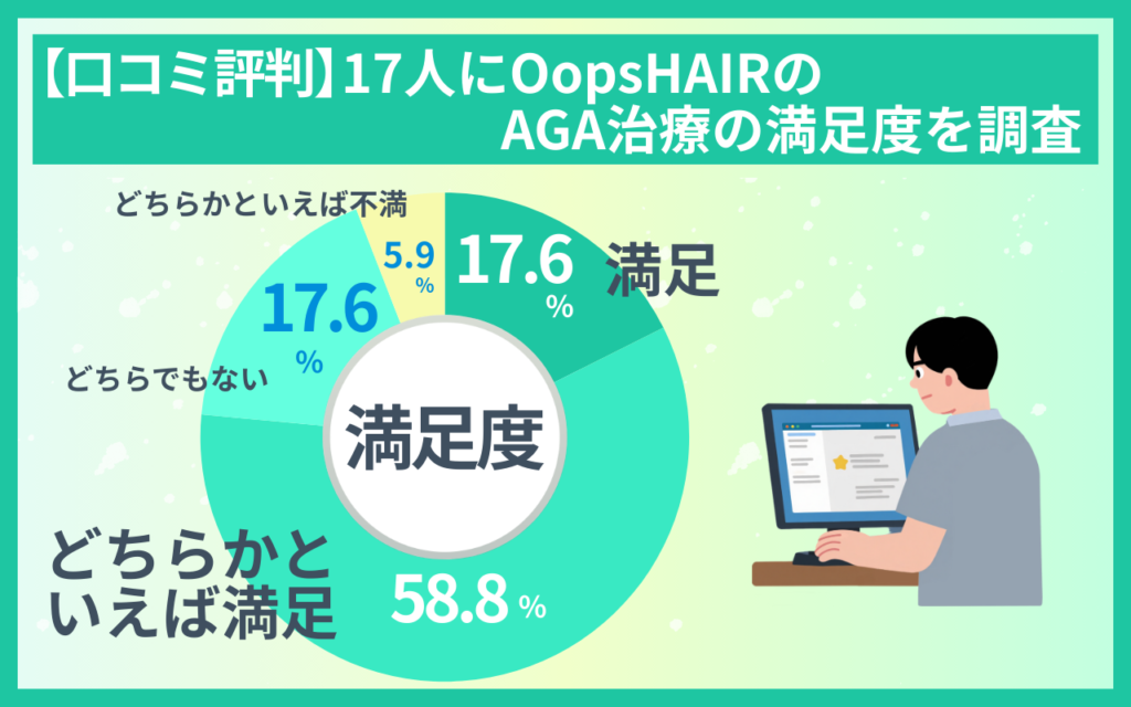 本項目では、独自アンケート調査結果を基にOopsHAIR(ウープスヘアー)のAGA治療の口コミ評判を解説していきます。